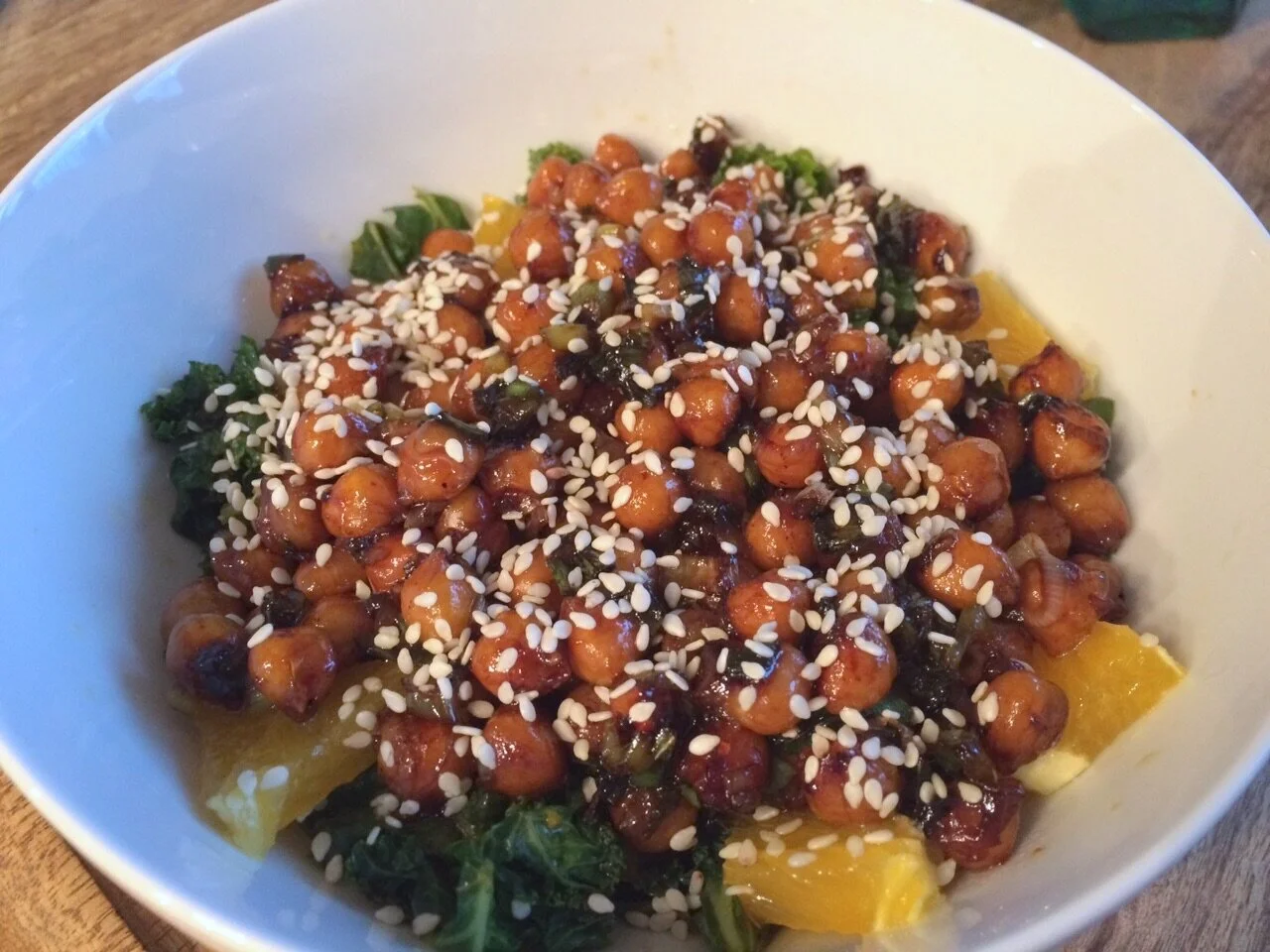 Over medium heat, heat oil in skillet and add ginger along with 2 tbsp of soy sauce and vinegar. When the soy sauce starts to thicken and caramelize, add the chickpea and mix all the ingredients well.